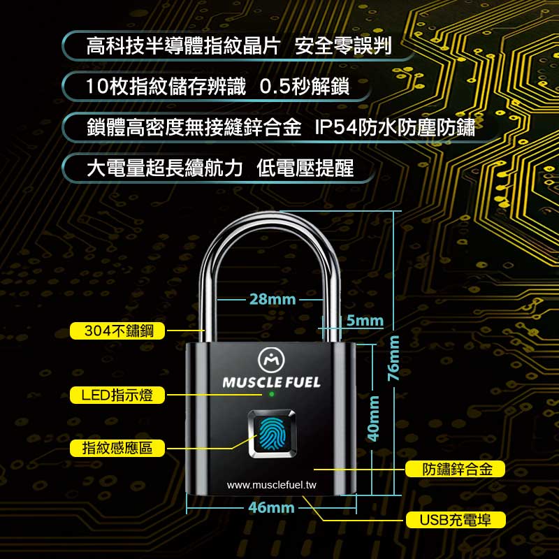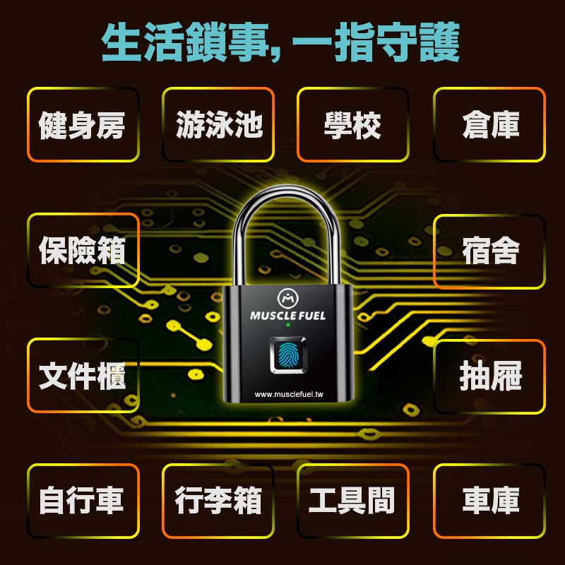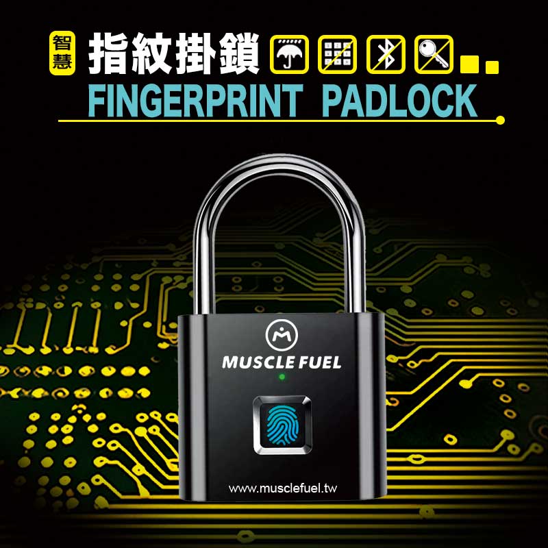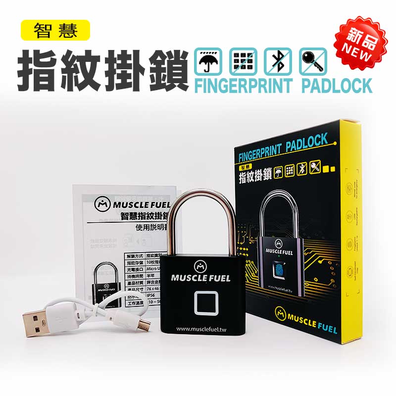 Muscle Fuel智慧指紋掛鎖內高科技半導體晶片,為市面上最新改良款,解鎖判斷更精準,指紋設定更簡易。商品盒內含Micro USB充電線與使用說明書以及說明影片QR Code。凡官方出貨(含購買與組合贈)皆享有商品一年保固。